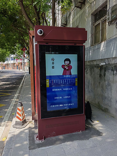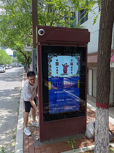 陕西立式55寸LCD屏电子站牌:55寸户外工业级低功耗高亮屏+蓄电池方案,预报站系统,信息发布系统等,配备200万像素的监控摄像头,硬盘录像机,事实查看电子站牌周边情况。